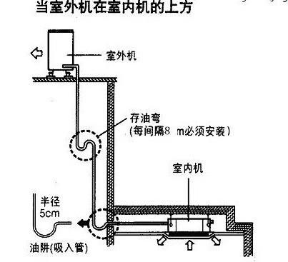 3、在室外機(jī)往下翻的地方做一個(gè)“止回灣”;