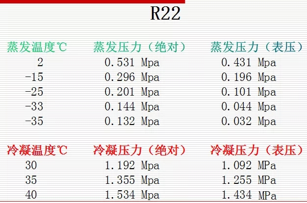 4、制冷劑溫度壓力對照表: