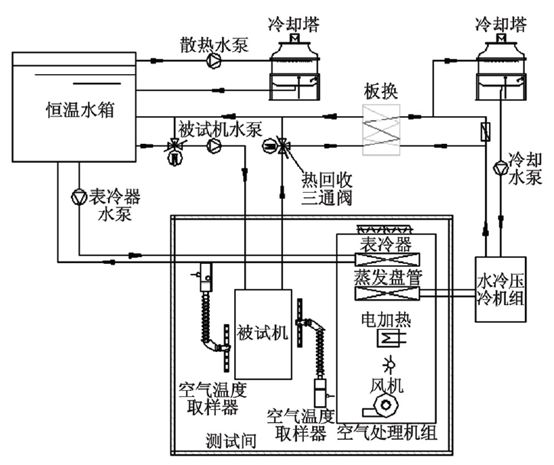 風冷冷(熱)水機組測試時,通過空氣處理機組將風冷冷(熱)水機組風側(cè)產(chǎn)生的冷熱量進行處理,使得測試間內(nèi)的溫濕度達到國標要求的值。而機組產(chǎn)生的冷熱水回到水箱后,通過水箱配置的冷熱源進行平衡,從而達到機組在國標要求的工況下穩(wěn)定運行,采集系統(tǒng)將所有的測點采集,通過電腦內(nèi)專業(yè)計算軟件進行計算輸出實驗報告。
