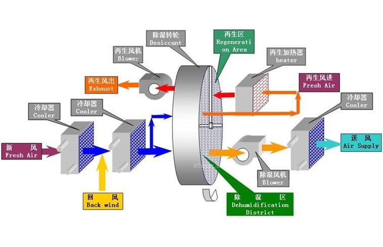 轉(zhuǎn)輪除濕機的核心結(jié)構(gòu)是一個不斷轉(zhuǎn)動的轉(zhuǎn)輪,是由特殊復(fù)合耐熱材料制成的波紋狀,載有吸濕劑的蜂窩狀轉(zhuǎn)輪,蜂窩狀轉(zhuǎn)輪具有吸濕比表面積大、流通阻力小、除濕效率高等特點。
