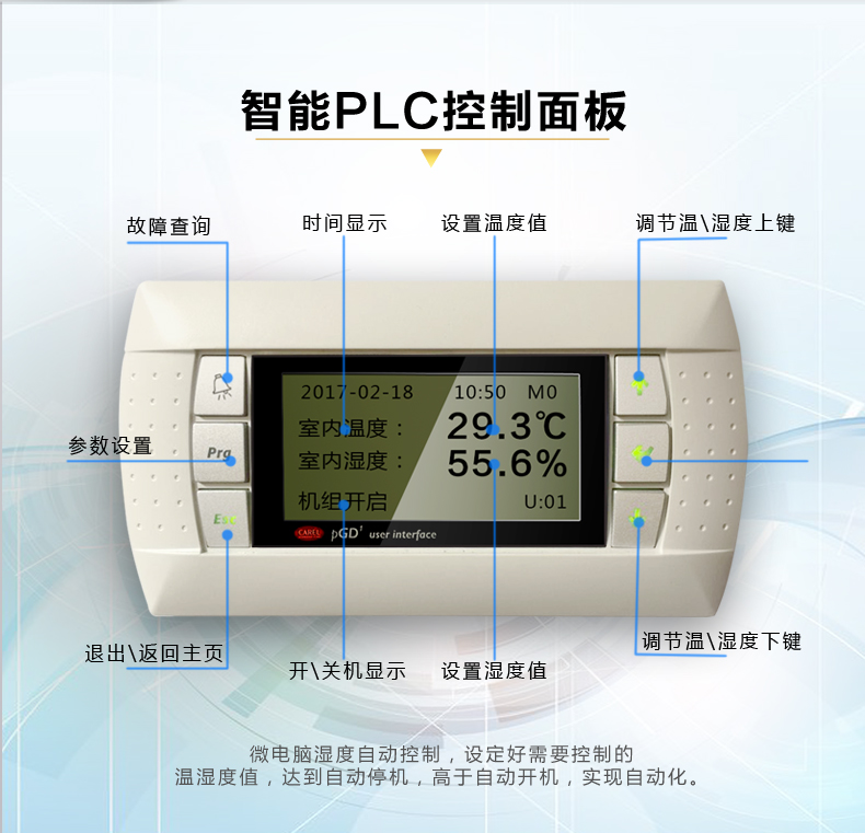 、高性能電子電極加濕器:不滋生細菌,對室內(nèi)空氣無污染;對水質(zhì)無特殊要求,無需水處理;獨立加濕器控制板,自動定時換水清洗,延長使用壽命,能自動根據(jù)加濕要求控制水位及加濕電極電流,實現(xiàn)高精度控制,真正滿足高精度要求;