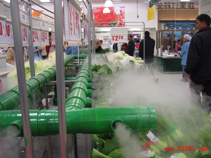 案例:超市的蔬菜柜臺,在霧氣中浮現的蔬菜水果,看上去就像清晨剛從果園菜地里摘下來一樣新鮮。據介紹,這是超市為延長蔬菜水果的“壽命”而啟用的新式“武器”,其噴出的霧氣一來可以保持低溫,二來能均勻保持水分,三來整個區域降溫造景。超市的蔬菜水果賣場中,一些青菜水果常因水分蒸發變質,導致“賣相”不好。新引進的噴霧系統令不少顧客好奇不已,經霧化的水汽可使空氣保持一定的濕度和低溫,使青菜水果常置于鮮嫩保質之中。